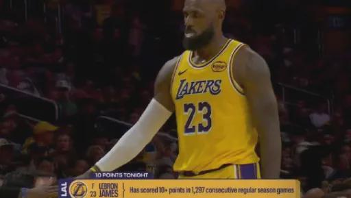 末节6分21秒,湖人落后25分,詹姆斯命中弧顶三分球成功得分上双;紧接着5分44秒,詹姆斯就被换下场,宣告比赛彻底进入垃圾时间。