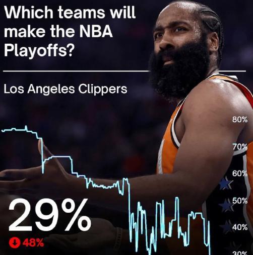 快船输球全怪哈登,正负值-39,球队进入季后赛概率仅有29%